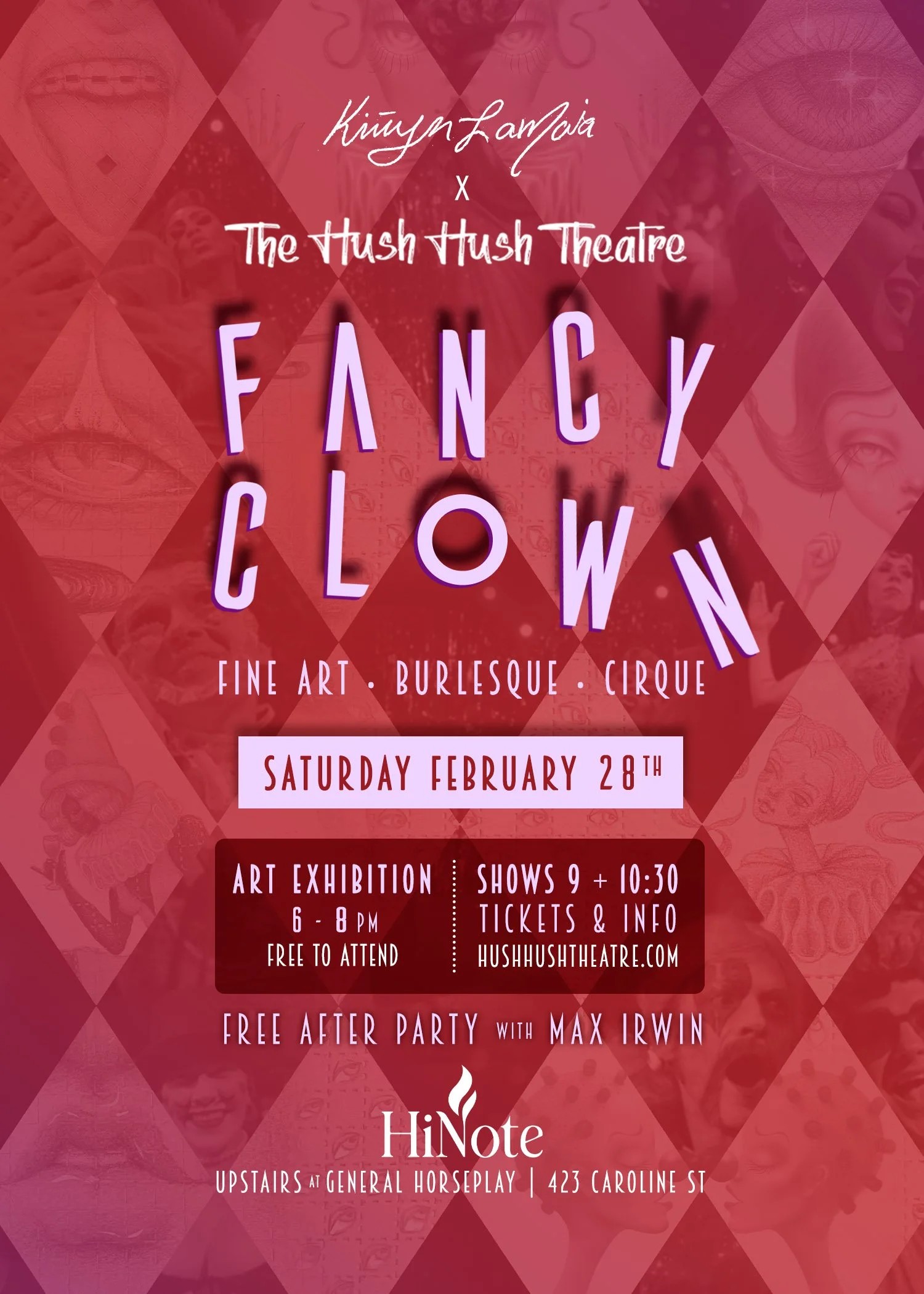We are fancy clowns who fancy clowns <:-) Escape into our world of sophisticated wonder and enjoy the mesmerizing work of local artist, Kristyn LaMoia. A fellow believer in the power of art to heal hearts, Kristyn’s new collection pushes galactic bounds and inspires true joy. We are delighted to create this special night with her. The FANCY CLOWN exhibit will be complete with themed cocktails by General Horseplay’s talented créateurs and the whimsical beats of DJ Max Irwin. Après! We rouge the night with cabarets at 9pm and 10:30pm—and a limit of 30 tickets per show—The Hush Hush Theatre will cultivate their signature cabaret experience including burlesque, drag, live music, comedy, cirque and much more. A one-of-a-kind evening with an entirely local cast of characters awaits.
